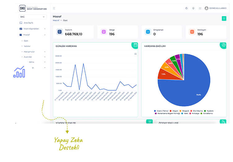 SNG Masraf Yönetimi ile şirket harcamalarınızı tam anlamıyla kontrol altına alın! Kullanıcı dostu ve sade ara yüzü sayesinde SNG Masraf Yönetimi modülü, şirketinizin tüm harcama kalemlerini anlık olarak takip etmenizi ve detaylı raporlarla analiz etmenizi sağlar. Manuel veri girişine gerek kalmadan yalnızca fişin fotoğrafını çekmeniz yeterlidir; sistem, harcama bilgilerini otomatik olarak tanır, kategori ve tutar gibi alanları kendiliğinden doldurur.Onay mekanizması esnek yapısıyla tamamen sizin iş süreçlerinize göre şekillendirilebilir. Ayrıca, dilerseniz harcamanın yapıldığı konum bilgisi de sisteme dahil edilerek denetim süreçlerine ekstra şeffaflık kazandırabilirsiniz. Tüm bu özelliklerle SNG Masraf Yönetimi, hem zaman tasarrufu sağlar hem de finansal disiplini güçlendirir.